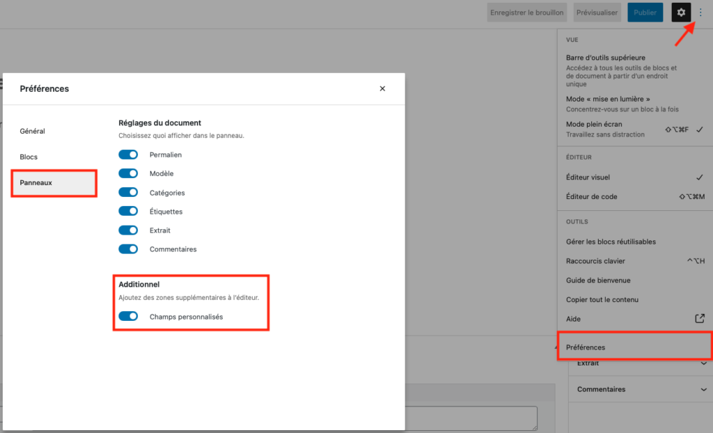 Si les champs personnalisés ne sont pas affichés depuis votre interface Gutenberg, vérifiez dans Préférences > Panneaux que leur affichage soit bien activé.