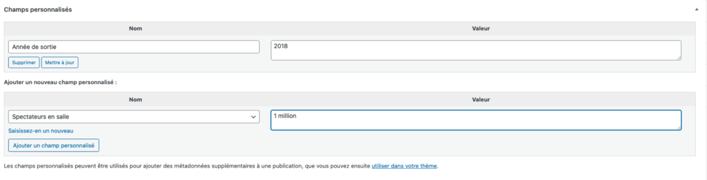 Ceci vous fera apparaître un encart avec la possibilité de renseigner des valeurs pour vos champs personnalisés.
